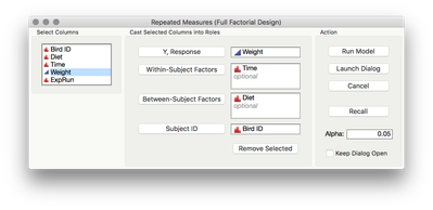 To set up the model using my add-in, we'll use Bird ID as the subject ID, Diet as a between-subject effect, time as a within-subject effect (and be sure that this column is marked as nominal), and weight as your Y. model.png