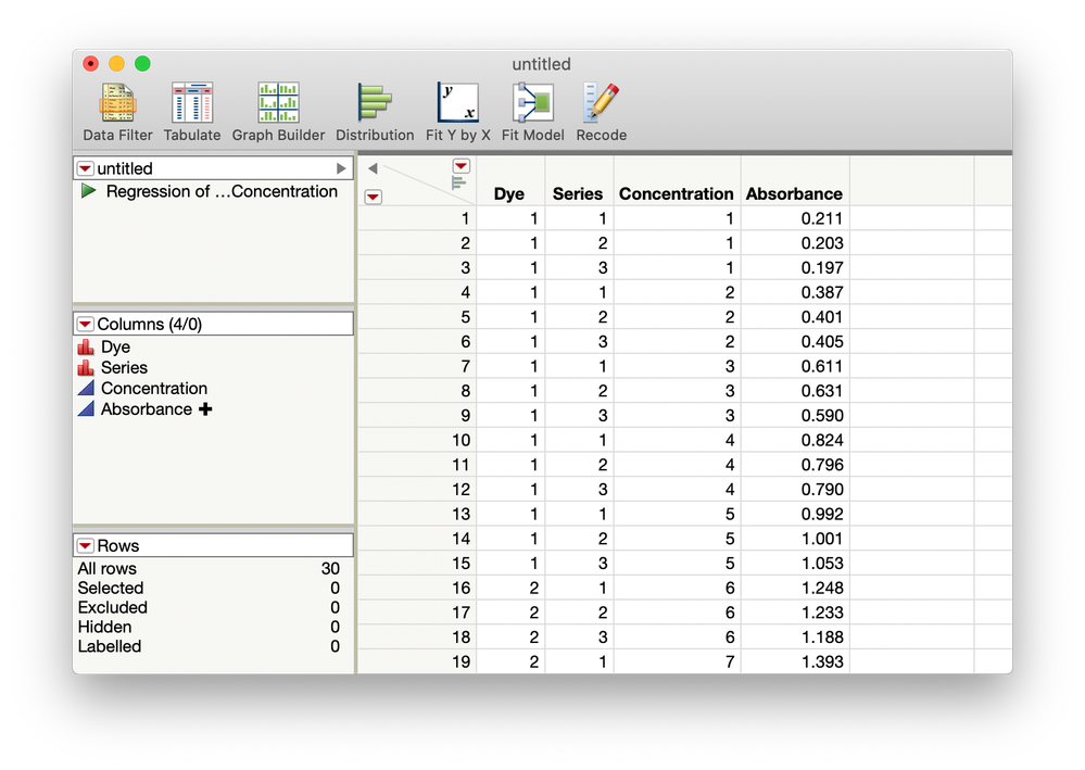 I collected datasets for the absorption behaviour for 2 different dyes. So I made absorption measurement for 3 different dilution series of the 2 dyes and consequentely want to analyze the data sets with JMP. My final goal is to get an averaged extinction coefficient of the 2 dyes and analyze each resulting graph (linear correlation) statistically among themselves. So far I just managed to analyze each graph by themself with Fit y by x. Can somebody help me with this problem?