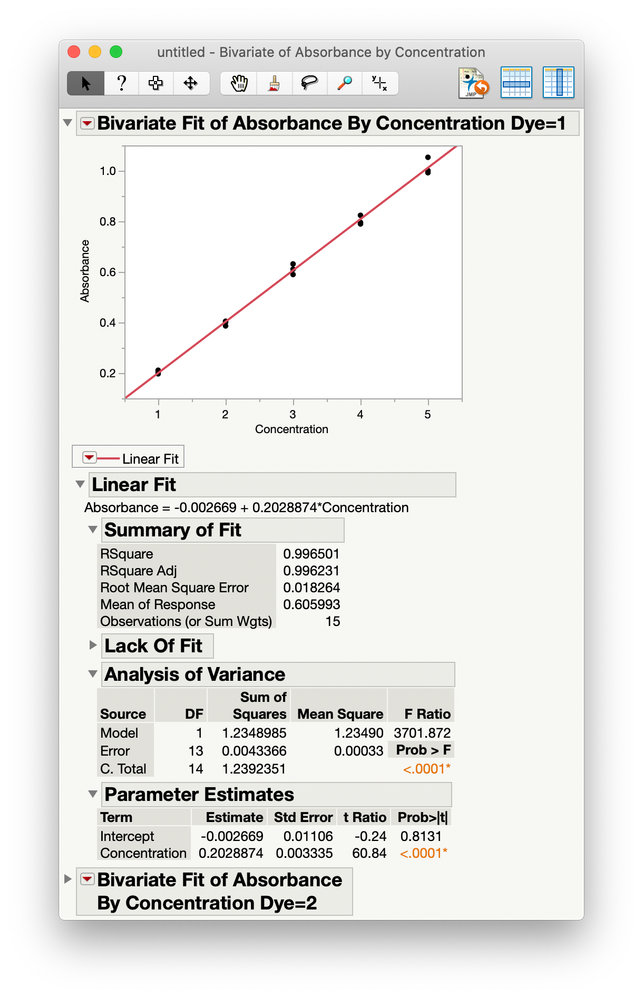 You can use Bivariate as before but include the three replicates in the regression analysis. Do not average the dilution series first. Put Dye in the By role to separate the data analysis but confine the results to one window.
