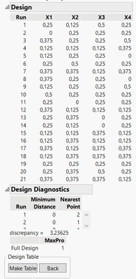 Then, I'm a bit lost on how to use the Distance Matrix to get the same informations as in the DOE Dialog from Space-Filling Designs : Minimum Distance, Nearest Points, MaxPro value and Discrepancy value.