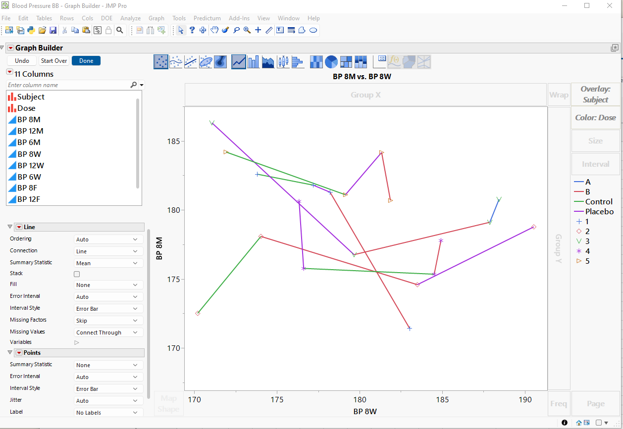 When I create a graph in graph builder with continuous data in the Y and the X axis, and use one categorical in the Overlay, I get continuous lines. But as soon as I put a second categorical in "Color," the lines change to dotted, etc even though the line style shows an uninterrupted line. This didn't use to happen and I don't know why it is happening. I had asked about this problem before and, unfortunately, the solutions didn't let work for my purpose.