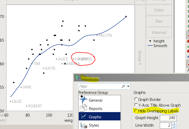 I want to build a chart that shows the labels for all of the points that have a high y value (interactive). I selected the top 20 points and set label for those rows. Not all of the labels display in the built chart. Is there a way to have the software put all of the labels in even if they are overlaping? I changed the jitter so that the points are more spread out, but the labels still don't apprear. In the image I'm showing the data and the chart. The selected points in the chart are the ones where I have added the label.