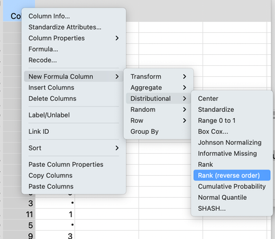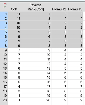 New Column( "Reverse Rank[Col1]", formula((Col Number( :Col1 ) - Col Rank( :Col1 )) + 1)),