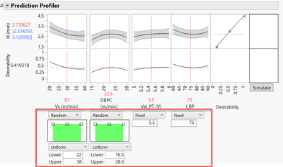 From your Fit Model results, click on the Prediction Profiler red popup menu and choose Simulator (the Simulator is also available from the Contour Profiler menu).