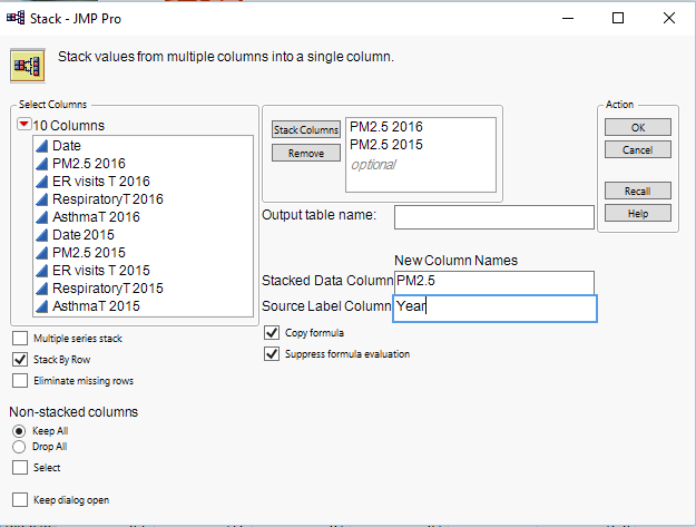 For clarity, I changed the default name of the new stacked column that will contain the data, from "Data" to "PM2.5", and the column that will indicate which of the stacking column the PM2.5 data came from, as "Year". Below is the result of the stack: