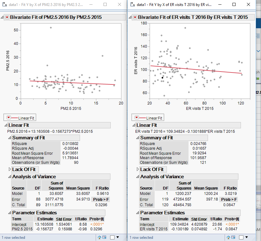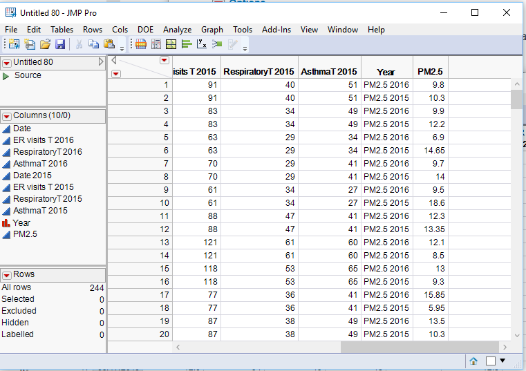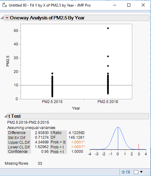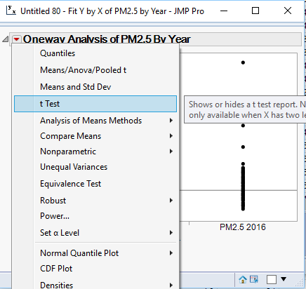 In the dialog box that appears, simply place the PM2.5 column in the Y Response selection box, and the Year column in the X Factor selection box and then click on the OK button