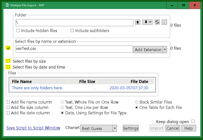 there are check boxes in the dialog that enable and disable the filter. Above, the name filter is enabled and the size and date filters are not in use. The values in the size and date filters are either (1) the last values you experimented with, or (2) the size range and date range of the file you selected. Most likely (2). So your file is probably 100 bytes long. The number is a JMP date-time value, you can use something like asdate( 3666002110.40841 ) to get