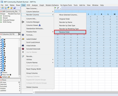 Create a Plackett-Burman design with row order "Keep the Same" :