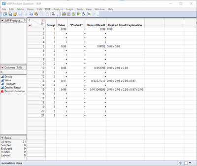 I am trying to get the "Product" column to be the product of all of the non-empty rows from the "Value" column. I show the manually calculated result and math in the "Desired Result" & "Desired Result Explanation" to the right.