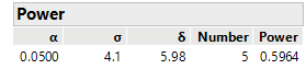 Imagine a two independent sample comparison of means. Assume sigma = 4.1 and delta (difference in means) = 5.98. If you use n=5 for each group, what is the power of an alpha = 0.05 two sample t-test? JMP tells me 0.59: