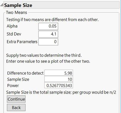 I am teaching a 2nd semester stat methods course to grad students not in statistics. This year is the first time in 8 years that I have taught it. 8 years ago, everything was SAS-based. This year, I am letting students choose among R (which I can support easily), SAS (also easily supported) and JMP (also easily supported for most things). My issue is setting up a power / sample size calculation in JMP. As far as I can tell, JMP requires you to set up an analysis, perhaps with mock data, then revise sigma, delta, and n for the situation at hand. I can do that either after Fit Y by X / pooled t-test or Fit model dialogs.