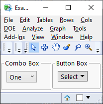 Names Default To Here(1); selections = {"One", "Two", "Three"}; nw = New Window("Example", H List Box( Panel Box("Combo Box", cb = Combo Box(selections) ), Panel Box("Button Box", btn = Button Box("Select", << Set Menu Items(selections)) ) ) );