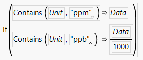 dtStacked << New Column("Data (ppm)", Numeric, "Continuous", Format("Best", 12), Formula(If(Contains(:Unit, "ppm"), :Data, Contains(:Unit, "ppb"), :Data / 1000)));