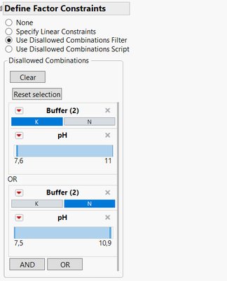 I am trying to generate a design with 6 factors in JMP, each of which has two levels. I am using two different buffers, and I want to use a separate buffer for each pH. When I use the 'disallowed combinations filter', and I constrain each pH to a specific buffer, I get an alert of  'optimal designer failed to converge'.