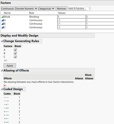 - Use the platform Screening Designs, specify three continuous factors A, B and C, and use the option "Choose from a list of fractional factorial designs" to choose the 8-runs factorial design with 2 blocks (4 runs per block) :