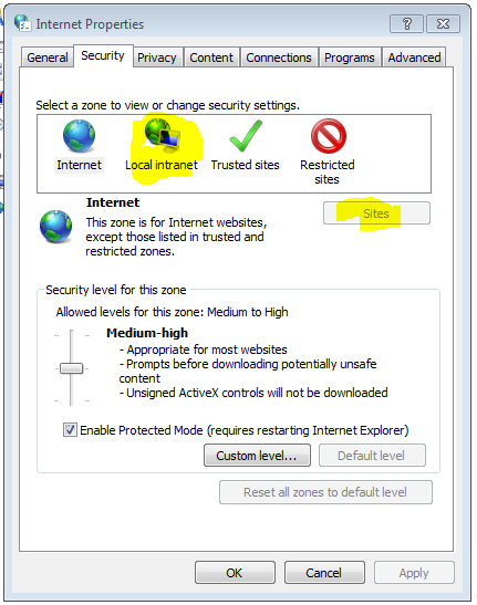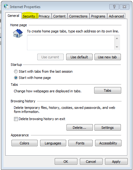 Control Panel internet optionsControl Panel internet options go to the security tab.