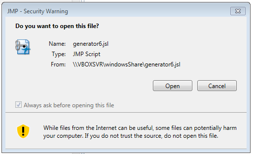 When I open files with scripts, I got "JMP security warning" with three options: Examine, Open and cancel (see attached).