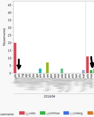 The problem is, there are so many users, it really becomes visually cluttered when usernames are given a space in a month where they don't show up. For example, the first blue arrow shows 'tz' having zero occurrences one month, and then the other blue arrow shows 'tz' having more than zero occurrences another month. The other colored arrows highlight the same thing with other names. I would love to be able to hide the names without any data for those months.