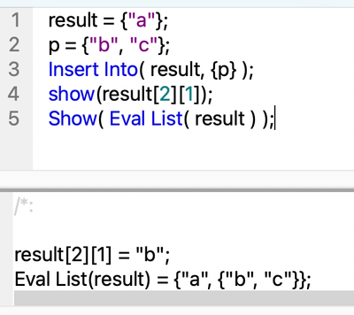 In Iterate through all combinations of values from ARBITRARY number of lists I posted an answer that required inserting a list into another list of lists. The InsertInto function unpacks the inserted list into elements, which is not what I want. I used an assignment statement to the element one beyond the end of the list, which does insert the list as an element. Another choice is to wrap the list in another list before inserting it (so it unpacks the wrapped list, and inserts the original.)