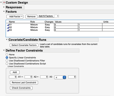 First, welcome to the community. I'm not sure I understand exactly what you want and from which platform you are using to create your mixture design, but you can certainly do linear constraints and set the value after the ≤,≥ sign in the DOE>Classical>Mixture Design platform: