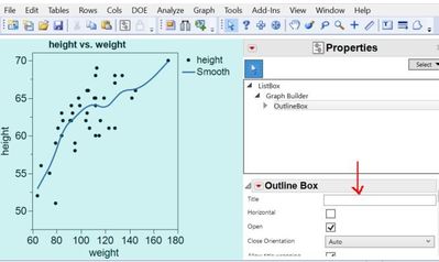 Below are a couple ways to do this. The first one was created by just clicking on the Outline Box titled "Graph Builder" and typing in the new title you specified you wanted to have. After the change I clicked on the red triangle==>Save Script, and the first script below is what it gave me. The second example below uses the JMP feature where within JSL one can change pretty much anything within the output of a platform.