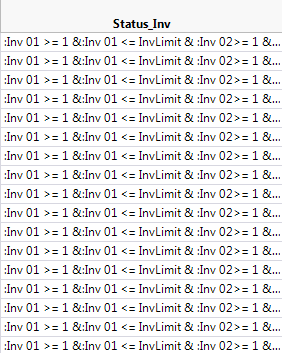 ":Inv 01 >= 1 &:Inv 01 <= InvLimit & :Inv 02>= 1 &:Inv 02 <= InvLimit & :Inv 03>= 1 &:Inv 03 <= InvLimit" Stmt = Substitute(Stmt, "\!"", "");