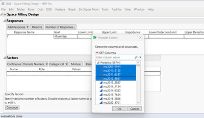 I have used the test data 'prostate cancer.jmp' to illustrate my attempts. For clarity, I reduced the dimensionnality using 2D multidimensionnal scaling. The color represent 20 clusters to select the best rows. The squared markers represent the 20 rows selected by the Custom DoE plateform.
