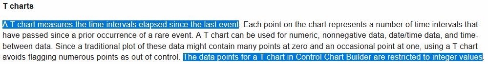 I can verify that, at least on my JMP Pro 18, the T chart does require integer values.  I'm not sure why - and I'm not clear on why that should be necessary mathematically or conceptually (perhaps it is a computational reason specific to JMP, but I don't know).  In any case, it isn't clear to me that your data is measuring the time between events.  You still haven't described what is being measured.  Nor do I understand what you are saying is wrong with the control limits I calculated in the file I attached.  Please refrain from the caps, bold fonts, and harsh words - it might be due to a language difference - but regardless I find it distracting and disturbing.  I don't use control charts much and so I don't have much background with anything but the most straightforward ones - which your case is not.  I'd like to understand what is appropriate for your data and I'm trying to help as well.  The section you quote that "a traditional plot of these data might contain many points at zero" also does not seem to match your data (which does not have this characteristic).  I know it would help me understand what is going on if you can say something about what these measurements are.