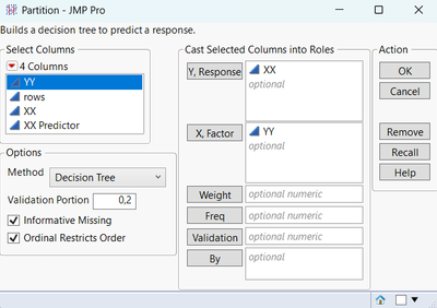 Please find attached the datatable with scripts of the analysis and graphs included, I hope this complentary answer makes the use of Partition platform clearer for you,