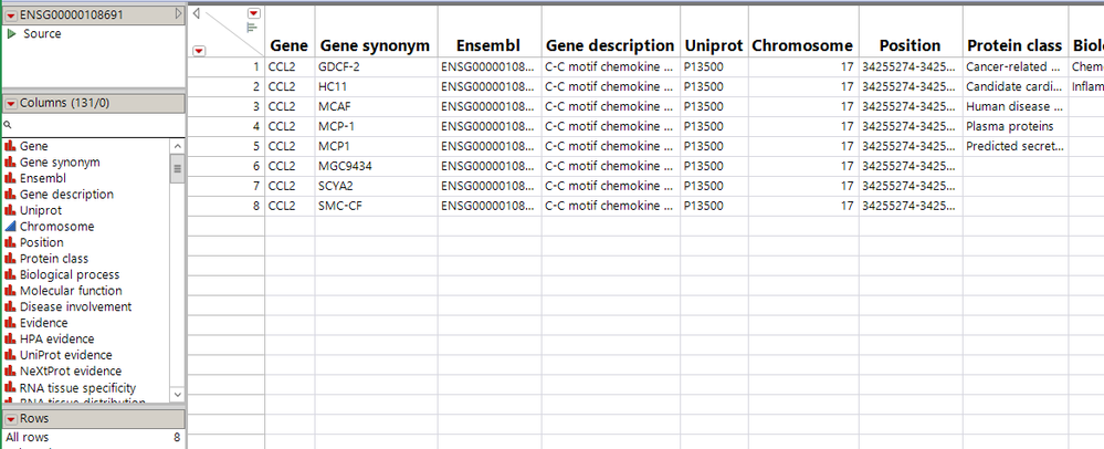 Actually, after reformatting (visual studio code worked), it probably makes more sense to use stack(0) and get 1 row. Each column is a list of attributes for that column (I'm guessing.) The synonym column has 8 possibilities. The protein class has 5 possibilities. They should not be aligned on rows like the first example shows, I'm guessing that's not what was intended.