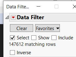 I am trying to apply a Data Filter using the JSL code below. It is selecting the called for rows but the Show and Include boxes are not checked in the Data Filter window, see below. What am I missing? After this filter I plan to run a CDF plot through the Fit Y by X portal then clear the Data Filter and reapply new Data Filter settings and run a different CDF plot. Thank you.