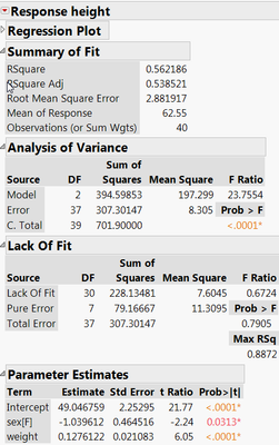 (1) The screenshot shows a linear regression fit to predict HEIGHT with SEX and WEIGHT as predictors. Although this main effect model doesn't appears to be under-fit, Max R Sq indicates a saturated model would achieve R Sq at 0.8872.
