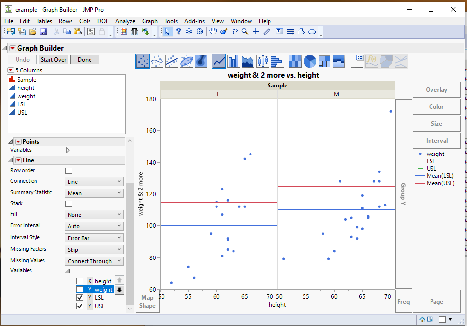 Je souhaiterai faire apparaitre des limites sur un graph dans graph builder sous JMP16. Ces limites doivent être définies pour chaque échantillon et par rapport à une valeur de départ variable. Je connais l'ajout de limites via les propriétés de colonne mais celles ci sont des valeurs fixes définies pour toute la colonne or dans mon cas la colonne contient les valeurs de diféfrents échantillons et pour chacun d'eux ces limites doivent être différentes.