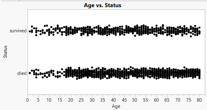 I mostly use logistic regression for binary reponse data. Here's an example using the classic Titanic survival data. The response variable is "Status", taking on the values survived or died. Using graph builder, I can make the plot that I believe Dale refered to in his last post, but without the logistic regression curve: