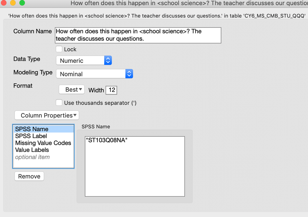 However, the following script, will quickly go through each column and change the column name to the value of the SPSS Name, if an SPSS Name exists