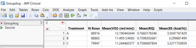 For a project I´m working on I have created a data table column (Animal No.Avg) where I am calculating some relative values for VO2 based on a baseline value (Treatment C) from table GroupAvg.