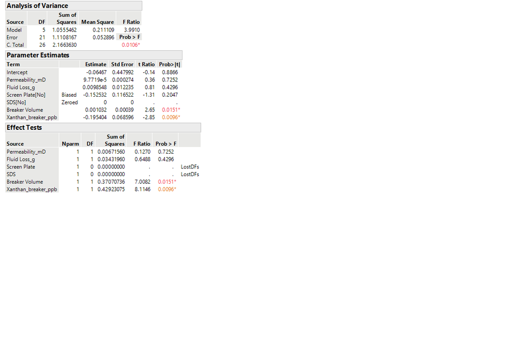 From the Parameter Estimates table: The words Biased and Zeroed. We don't want to be biased! That should tell you to not trust the results -- they are biased! And Zeroed means that JMP "deleted" those terms from the model in order to try and give you some results. However, JMP really does not know the system so there is no way for JMP to know which terms should have been removed. A mathematical choice is being made based solely on the order of the terms you specified in the model.