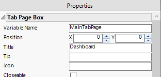 The red-triangle menu for the top-level TabPage in a Dashboard comes from a script embedded in the Dashboard. The default Dashboard templates create a variable `MainTabPage` to refer to this box (objects visible if you toggle Show Properties):
