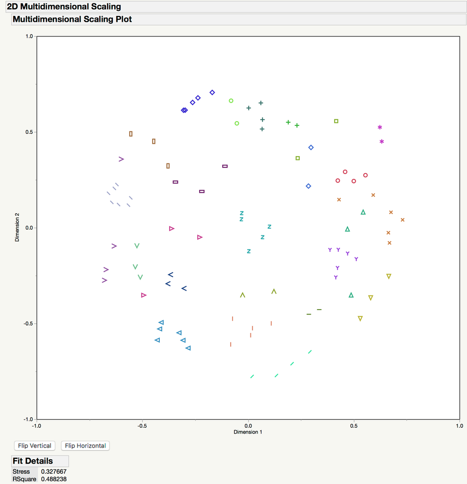 I'm using multidimensional scaling on a 91 x 91 distance matrix. When the 2D MDS plot is displayed, the points are plotted using various different symbols and colors assigned by JMP, evidently clustering points togethers based on their proximity in the multidimensional distance space (see attached screenshot). Questions: