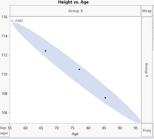 From Fit Y by X, Multivariate, AND Graph Builder, I get the same value for r, which is -0.981. I have included the Graph Builder report that shows this in the upper-left of the graph.