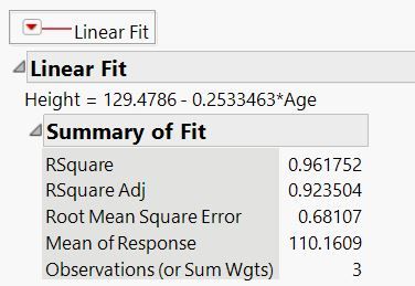 If I fit a linear regression line to the data I get an RSquare of 0.962 from both Graph Builder and Fit Y by X.