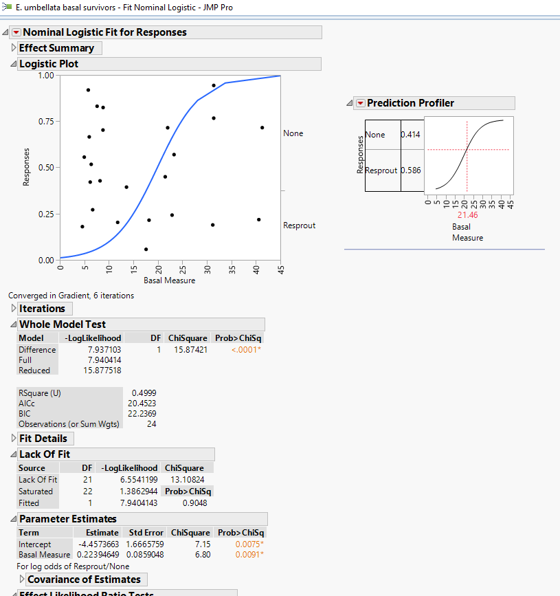 For my masters project, I am attempting to run a nominal logistic regression to show that as the basal diameter of an invasive plant species increases, its likelihood to resprout also increases following treatment of an herbicide. The data certainly seems to show this and the prediction profiler (pictured) seems to support this, but the created graph seems to show the opposite (pictured).