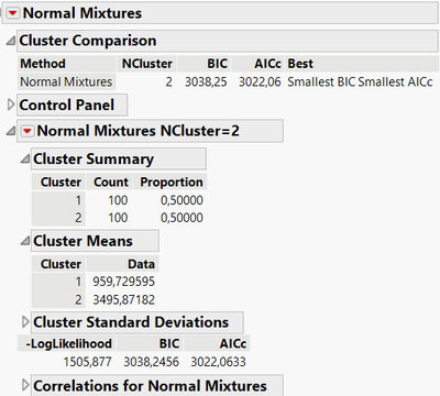Meanwhile, that approach has been implemented in Life Distribution's "Fit Mixture". After fitting a mixture, use "Save Predictions" to get the p1 * Normal Density(x, mu1, sigma1) and p2 * Normal Density(x, mu2, sigma2). And it is up to you how to handle it. You can use a simple comparison like what I described. Or you can use the values in more sophisticated ways.