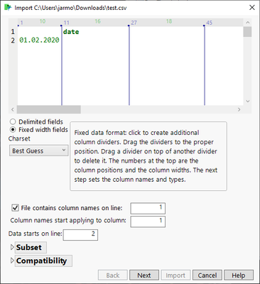 Does have "$DOWNLOADS/test.csv", and Fixed Column Widths(13, 3, 7, 9, 11, 6, 90). Are these still missing something?