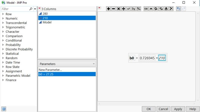 Now go to the nonlinear fit platform. This Model column is the X, Predictor Formula. The 280 column will be the Y, Response column. Click OK. In the Nonlinear Control Panel, click Go. When it stops, the b0 parameter should match the Fit Orthogonal Results. Then click on Confidence Limits button to see the confidence interval.