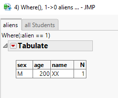According to the data filter and the subtitle, Tabulate should list aliens - but in the list are all rows with the respective age, independent of the values in column alien and dummy.