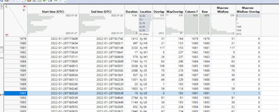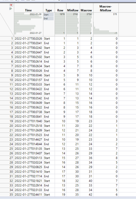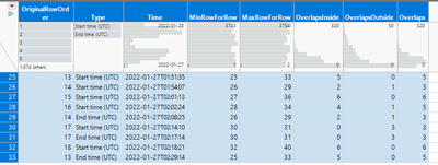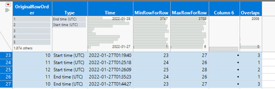 "You should be able to do this also almost interactively in JMP by creating new datatable with three columns: Time, TypeOfTime(start,end) and original row number. Then sort it by ascending and write a formula to check for overlaps (Could maybe use Lag(), I used Col Min(Row(), :Row) and Col Max(Row(), :Row()) and their difference). Finally create summary table to get max value / join back to original table based on row numbers."