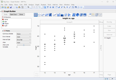 Then I opened Graph Builder, and dragged column Height to the Y axis drop area, and the column Age to the X axis drop area.
