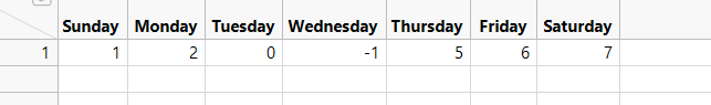 On Element( "Rule", End Tag( New Column( XML Attr( "DayName" ), Set Values( Eval List( {XML Attr( "Val1" )} ) ) ) ) )