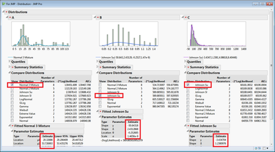 This code works for me in JMP 11. The selected distributions and parameter estimates are stored in an associative array as keys and values respectively, but there are of course other options (e.g. data tables).